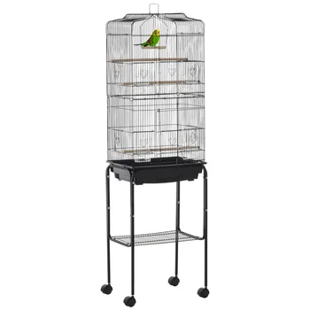 Jaula para Pájaros con Soporte, 4 Ruedas y Comederos, 46,5×36×157 cm, Color Negro